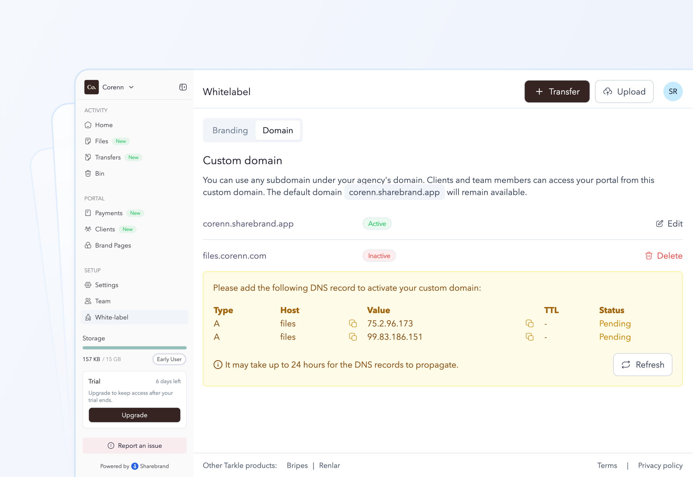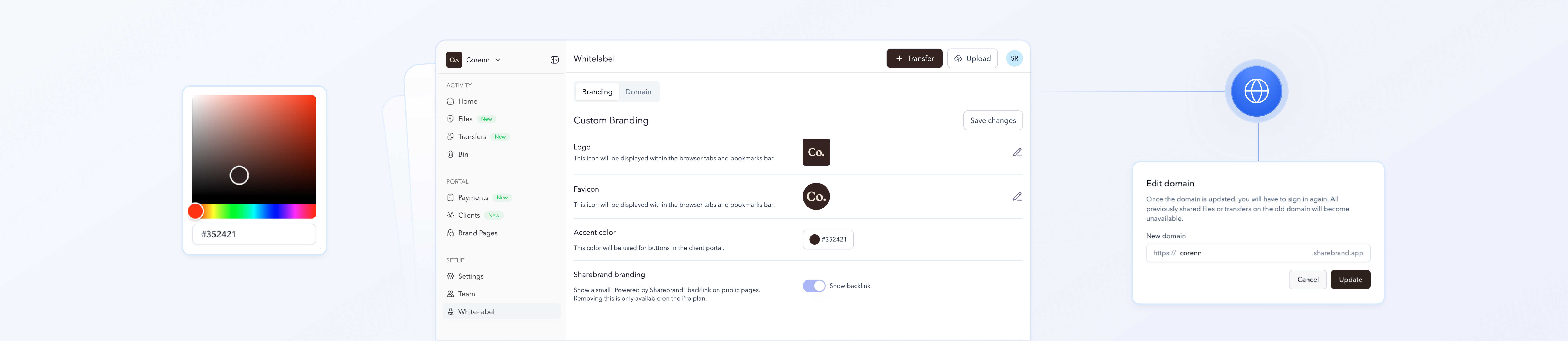 Use your own domain for file delivery portal and email notifications instead of Sharebrand branding.